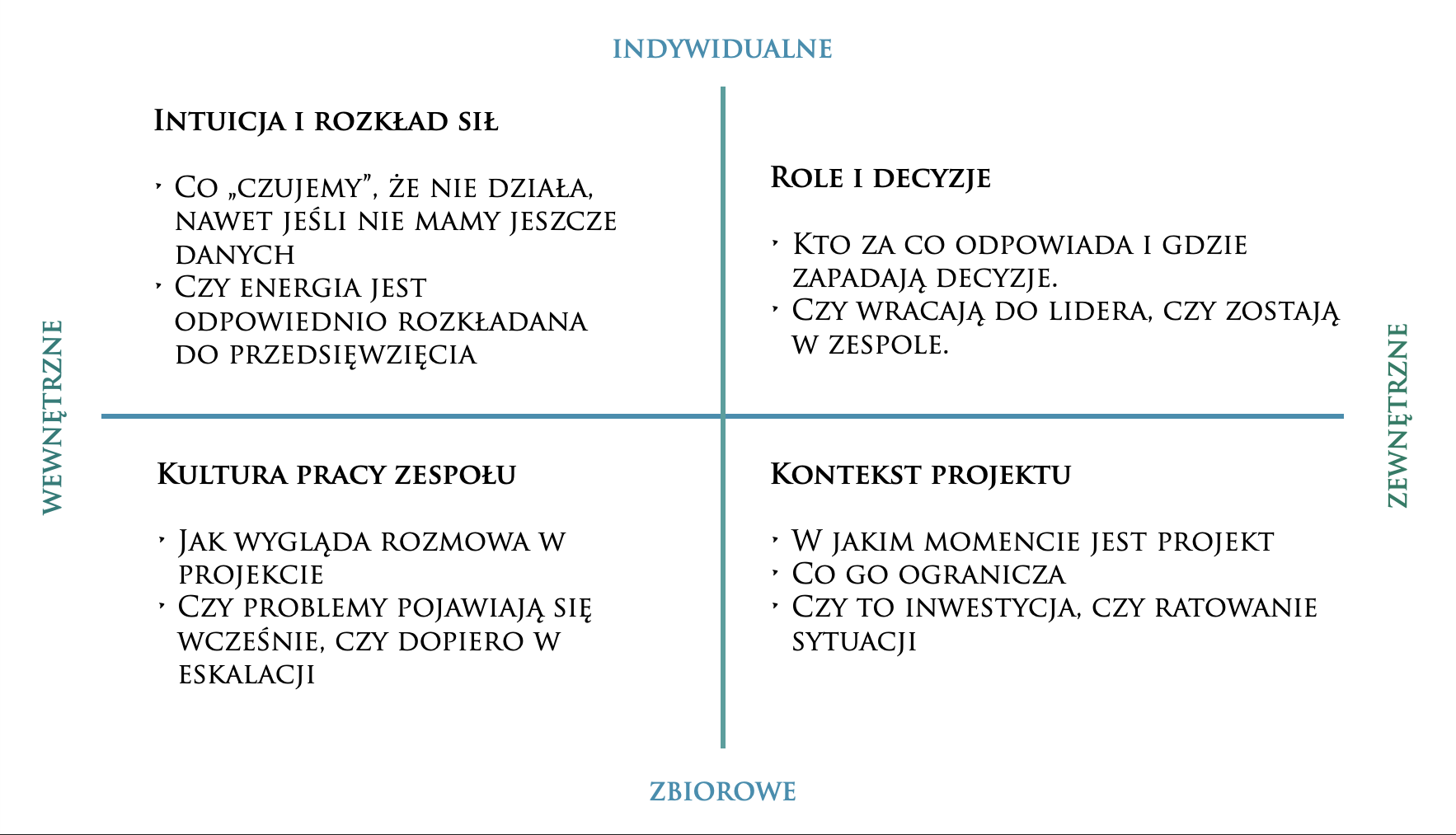 Potem patrzymy na cztery obszary, które decydują o tym, czy projekt działa.